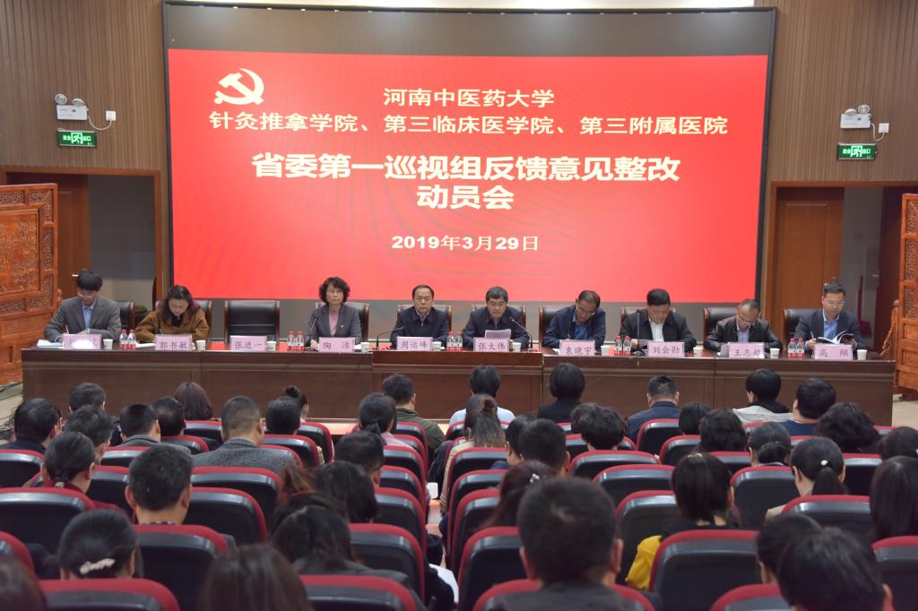 本网讯(文/胡兴旺 图/田辉)为学习贯彻省委对巡视工作的有关要求和工作部署,落实《中共河南中医药大学委员会关于印发<河南中医药大学关于省委第一巡视组反馈意见整改工作方案>的通知和《中共河南中医药大学委员会关于下发省委第一巡视组反馈意见整改任务台账的通知》,动员三附院上下以高度的政治自觉、思想自觉和行动自觉抓好反馈意见的整改落实,2019年3月29日下午,三附院在医院学术活动中心二楼召开了省委第一巡视组反馈意见整改动员会。三附院领导班子成员,各党(总)支部书记、直属党支部书记,中层干部及护士长参加了会议。会议由党委副书记、院长张大伟主持。